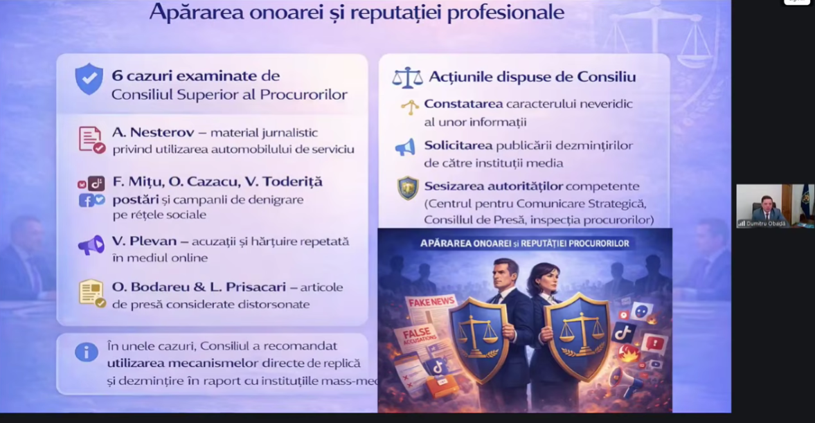 De asemenea, a fost analizat cazul unui procuror, care ar fi fost supus unor acuzații și hărțuiri repetate în mediul online, precum și situația ce îi implică pe alți procurori, în legătură cu articole de presă considerate distorsionate.