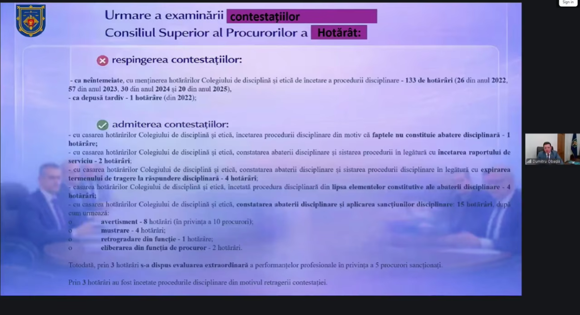 În plus, prin alte hotărâri, Consiliul a dispus evaluarea extraordinară a performanțelor profesionale pentru cinci procurori sancționați. De asemenea, în trei cazuri, procedurile disciplinare au fost încetate ca urmare a retragerii contestațiilor.
